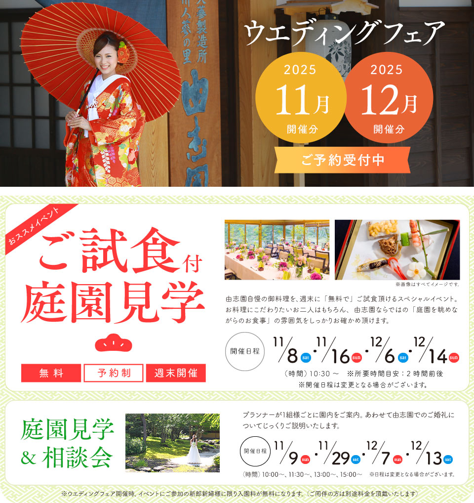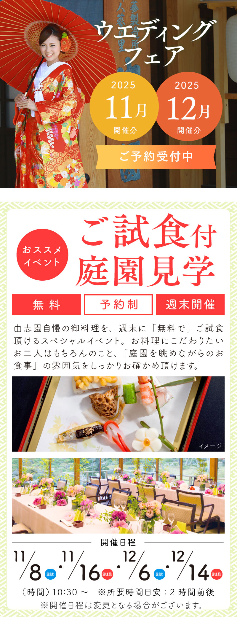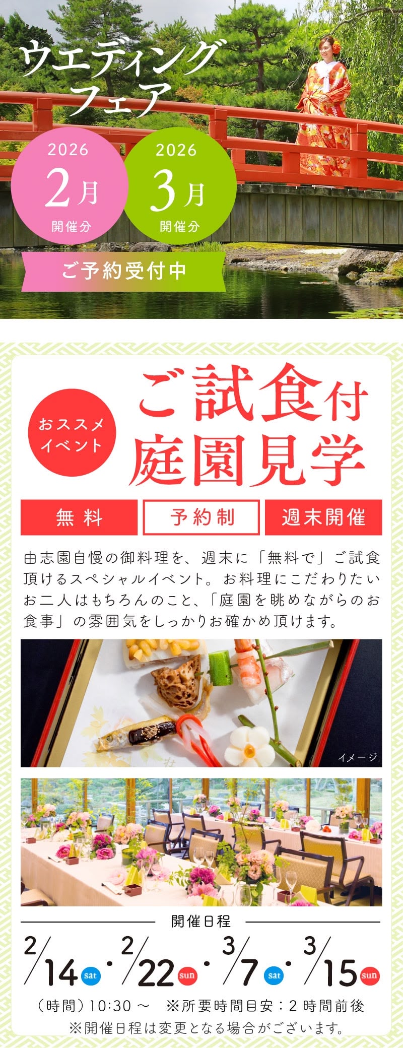 | 注意事項 | ※ご予約はご希望日の3日前までにお願いいたします。 ※庭園見学・由志園ウエディングのご説明後、ご試食をお召し上がり頂きます。 お食事のお時間は約1時間30分後になりますのであらかじめご了承ください。 ※新郎新婦様に限り、「特製ご試食メニュー」を無料にてご用意させて頂きます。 ※ご同伴の方もお食事をご希望の場合はご予約時にお申込みください。同伴の方は別途料金を頂戴いたします。 ※新郎新婦様に限り、入園料が無料になります。 (ご同伴の方は別途料金を頂戴いたします。) |